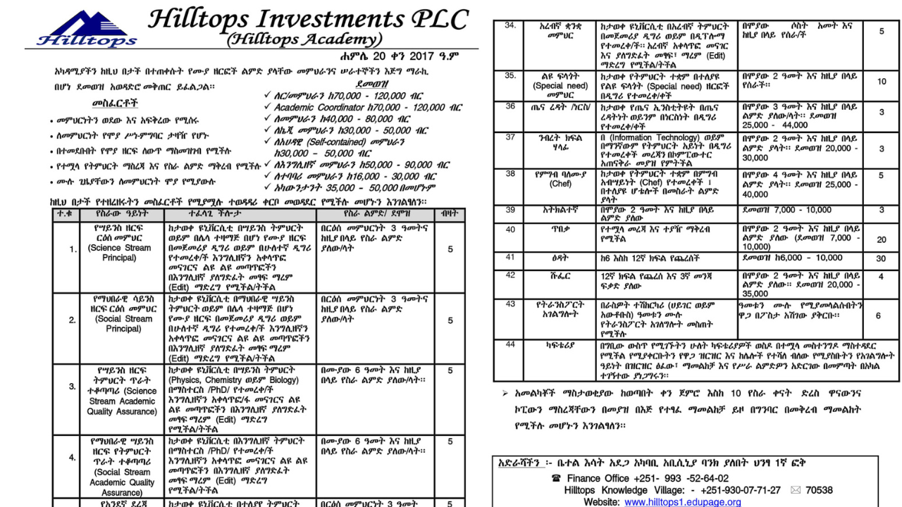 Hilltops Academy Job Vacancy 2025 – Apply Now Are you an experienced and passionate educator looking for an exciting opportunity in Ethiopia? Do you have a strong command of English and a love for nurturing young minds? Hilltops Academy and Knowledge Village is opening its doors to qualified professionals for the 2025 academic year — … Read more