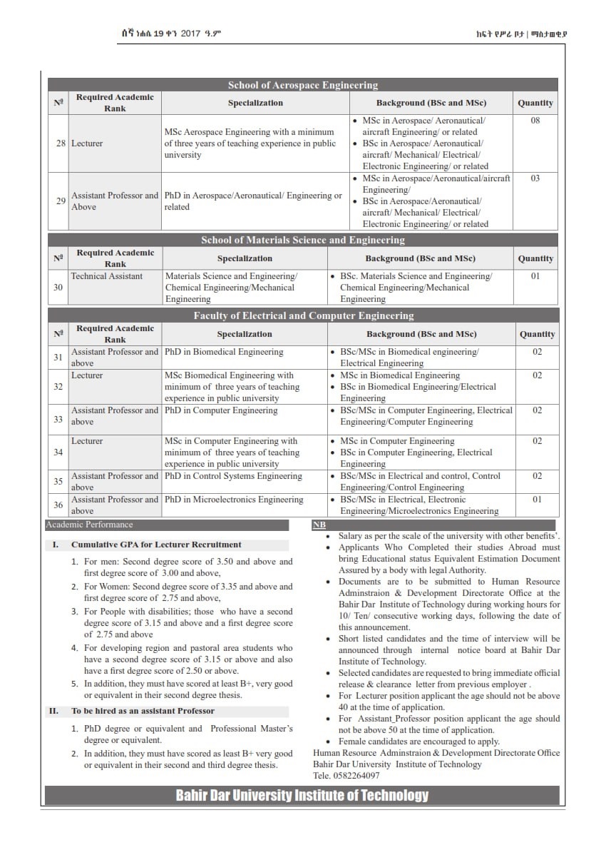 Bahir Dar University is hiring across the following faculties: