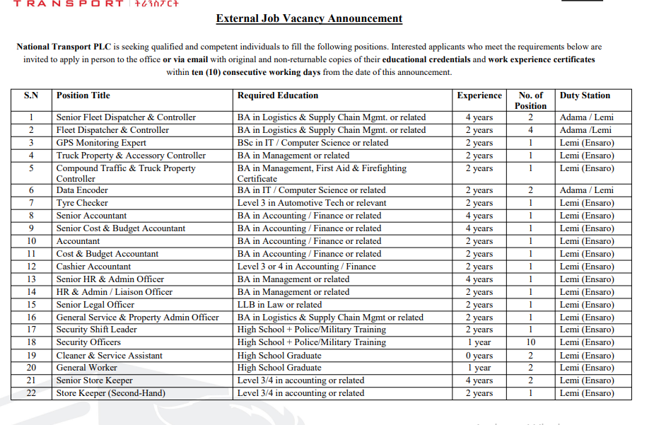 Please submit your application within 10 working days from the date of this announcement to the HR Office at National Transport PLC, Dire Dawa or Adama. You may apply in person or contact us using the details below: