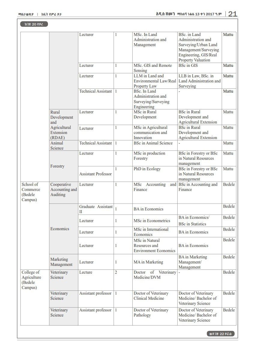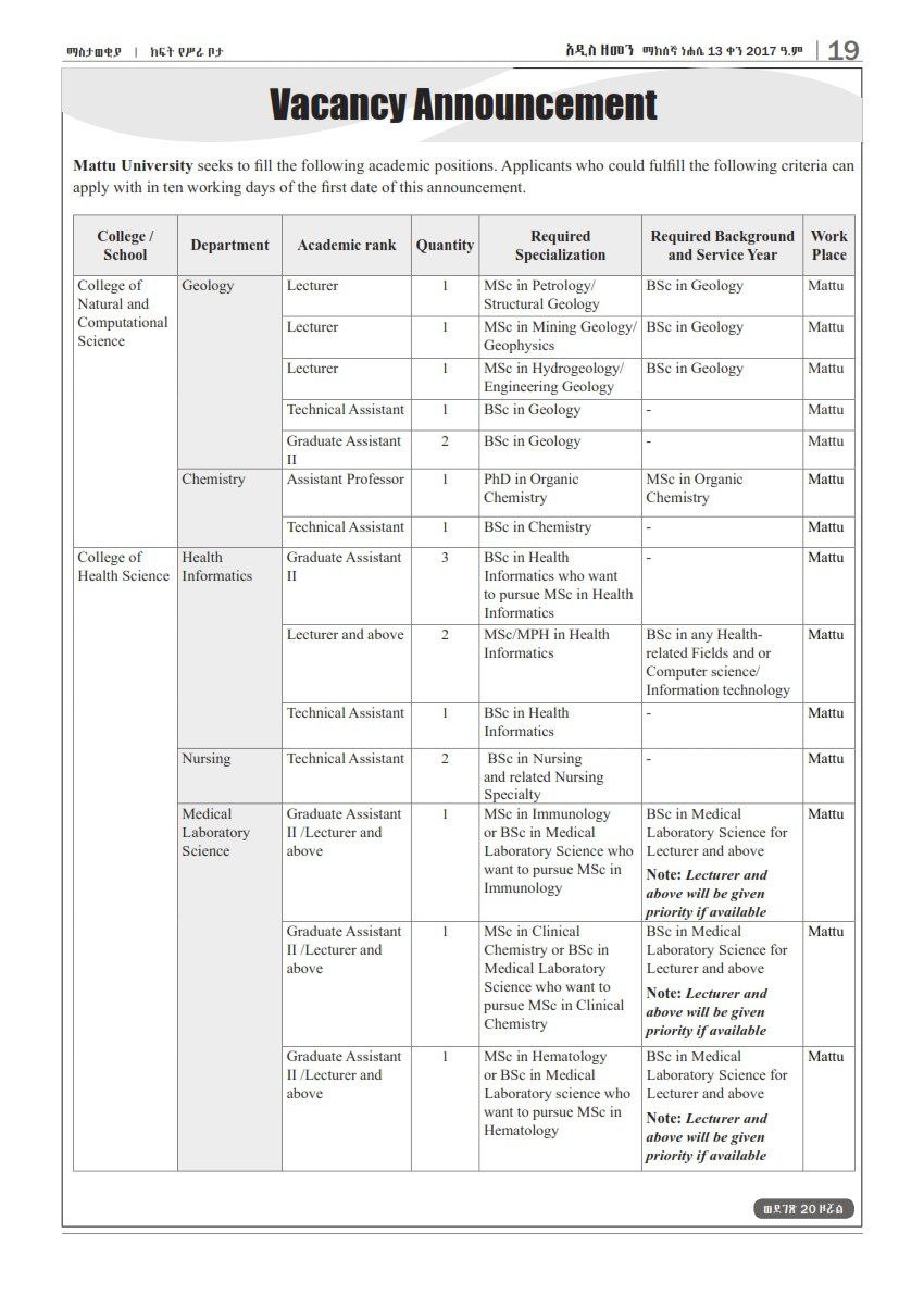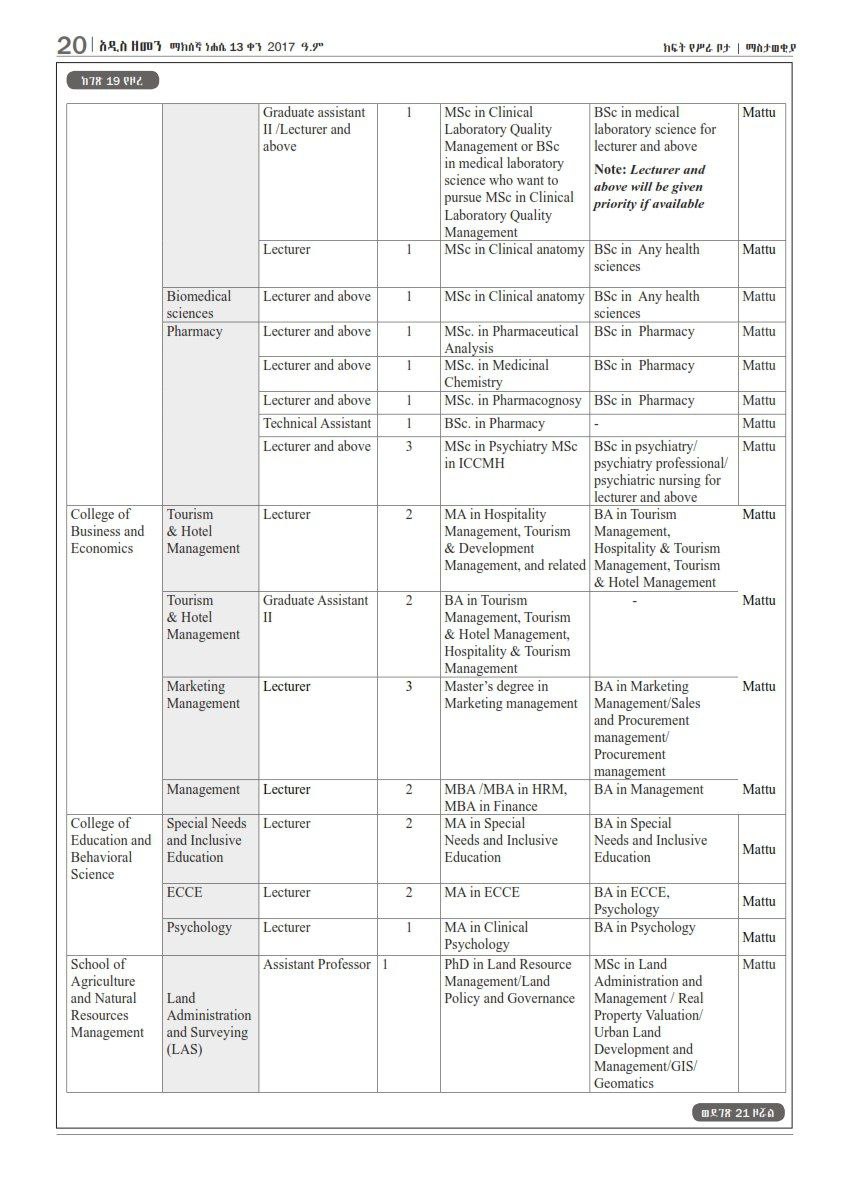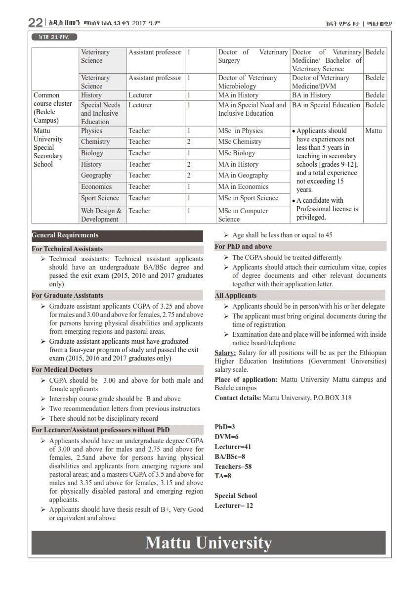 Mattu University (MaU), one of Ethiopia’s leading public higher education institutions, is pleased to announce multiple academic and technical staff vacancies across various colleges, schools, and departments.