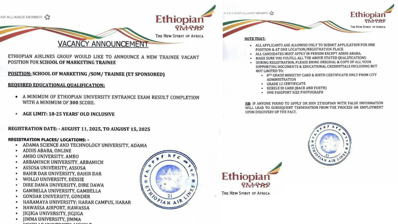 Ethiopian Airlines Vacancy 2025 – Fresh Graduate Opportunities Application Dates: August 11 – August 15, 2025 About Ethiopian Airlines Ethiopian Airlines, Africa’s leading aviation group, has been operating for over 78 years, connecting Africa to the world. With more than 150 modern aircraft and over 100 new aircraft on order, Ethiopian has earned a reputation … Read more